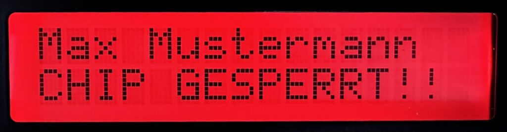 ![]() | Der Chip wurde gesperrt (fehlende Fülleinweisung/Austritt/Verlust) |
