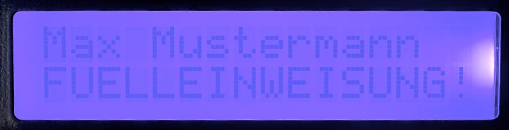 Zum Jahreswechsel werden alle Chips auf „Fülleinweisung erforderlich“ gesetzt. Ohne erneuerte Fülleinweisung zum Jahresbeginn (Termine werden bekannt gegeben) ist ein Füllen nur noch begrenzte Zeit möglich und die Anzeige am Display zeigt den Hinweis an: