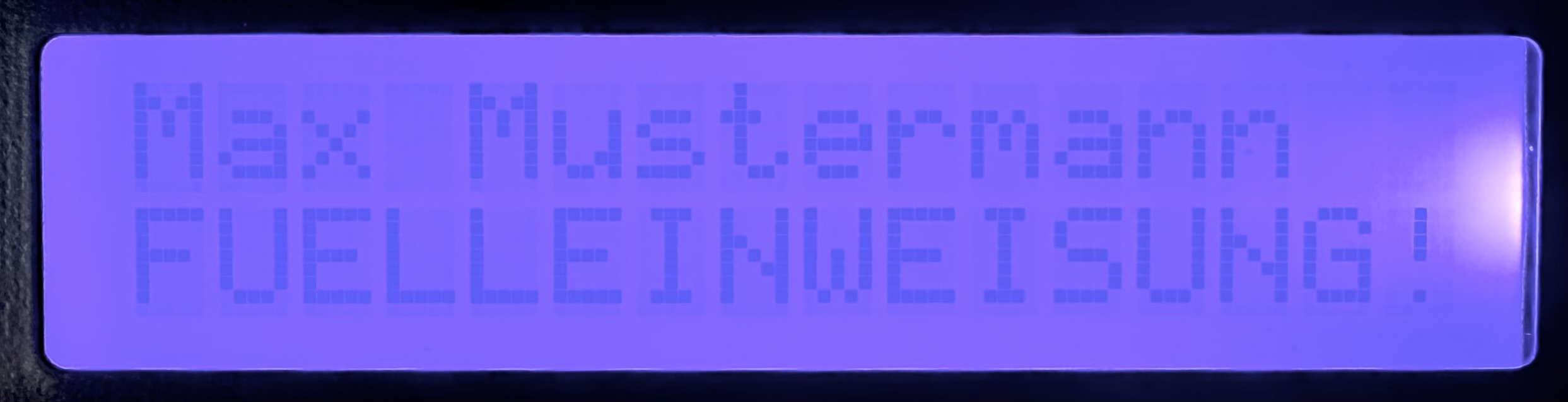 ![]() | Anzeige wenn der Chip erkannt wurde. Der Name wird angezeigt und die Anlage ist bereit zum Füllen. Der Füllvorgang startet nach drücken der EIN Taste am Gehäuse |